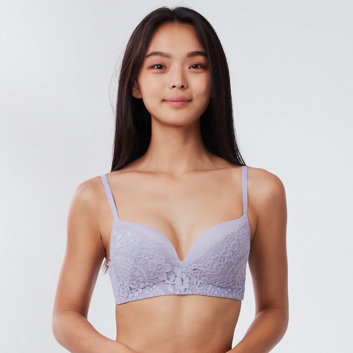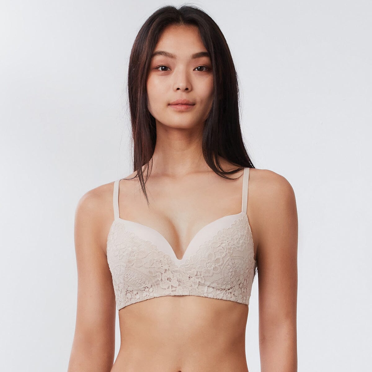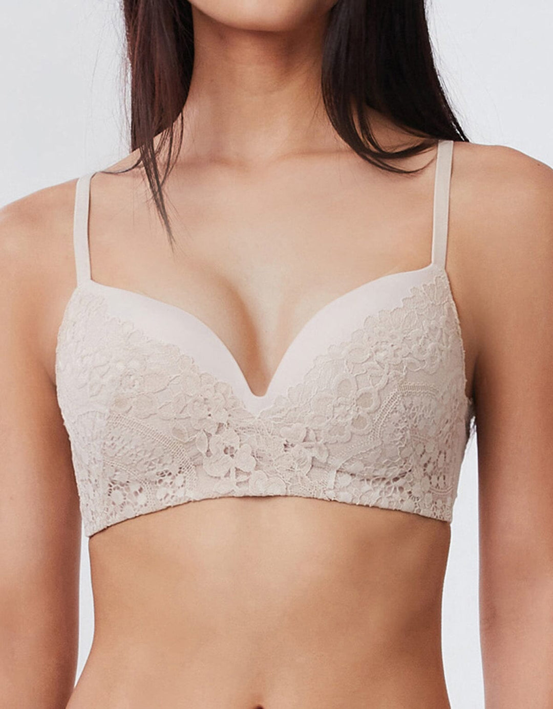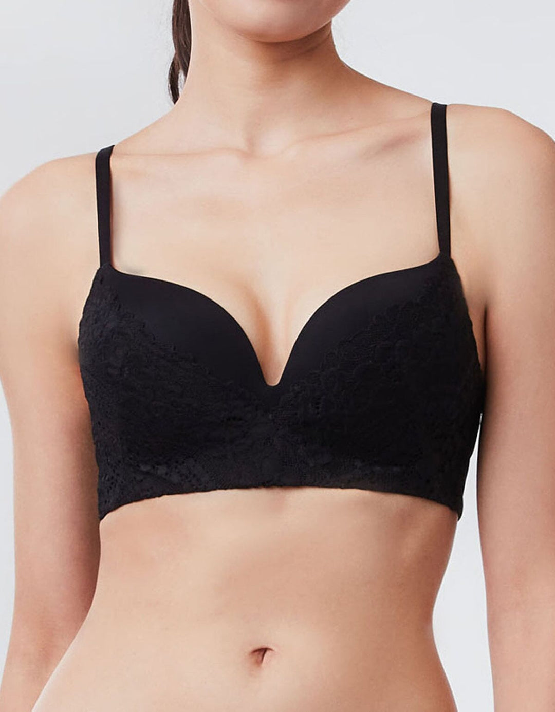 無鋼圈Push up胸圍採用柔軟舒適罩杯, 配合W 形軟支撐設計, 提供零壓舒適承托!